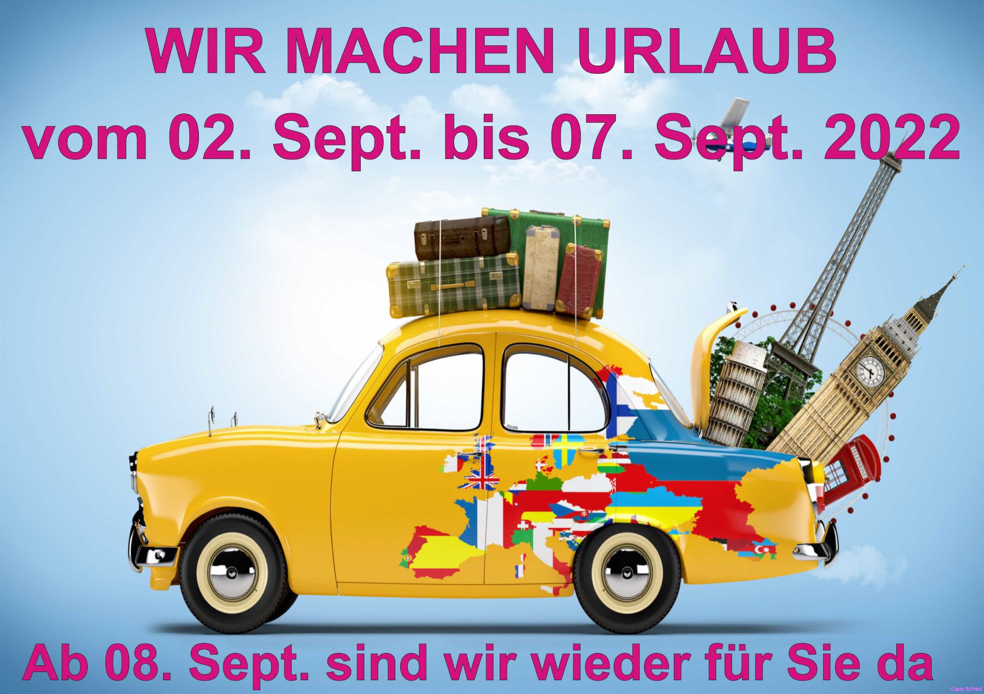 Wir machen vom 2. bis 7. September 2022 Urlaub.Am 8 September sind wir wieder für Sie da.