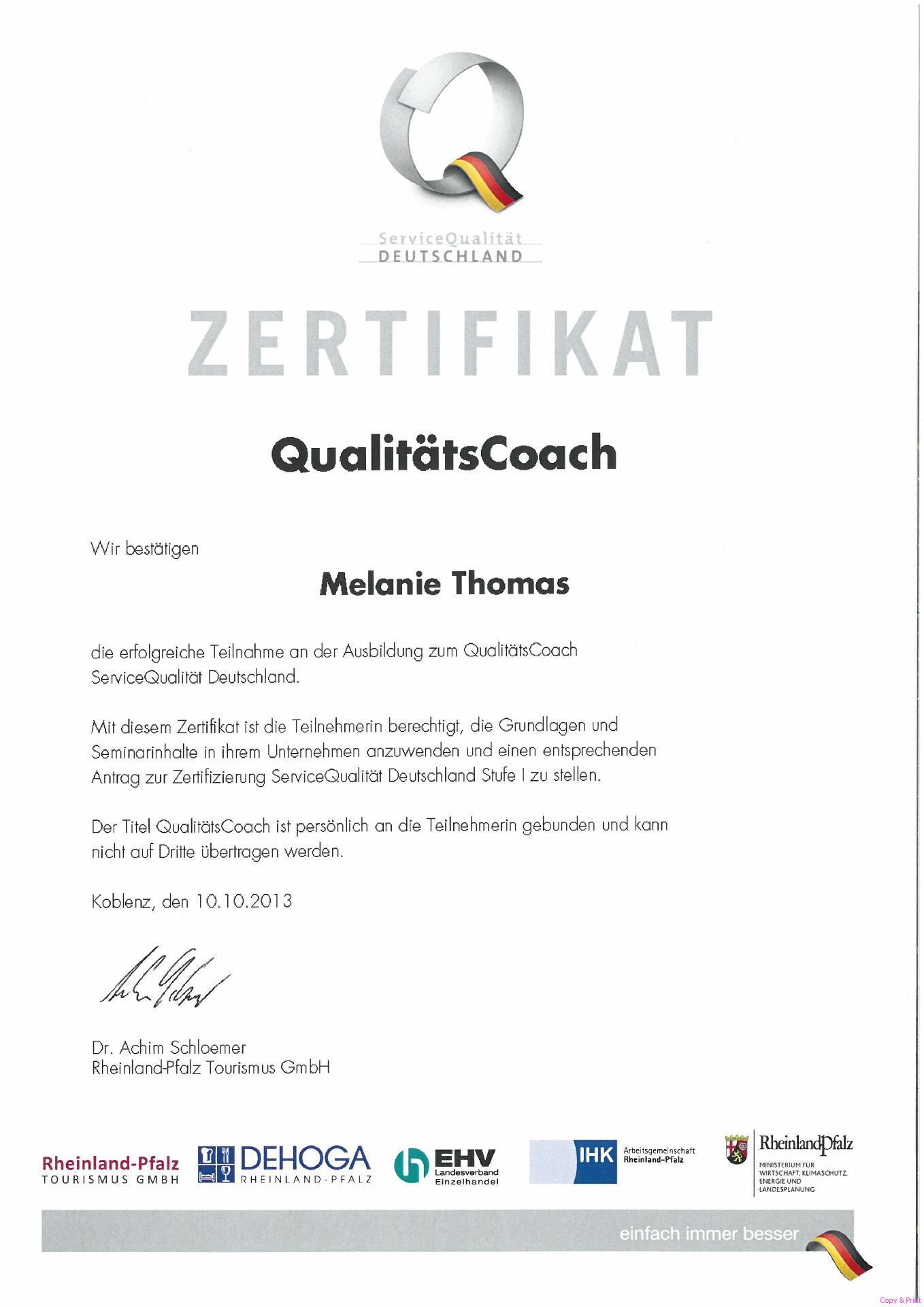 Unsere engagierte Mitarbeiterin, Melanie Thomas, hat die Ausbildung zum QualitätsCoach bestanden. Damit ist unser Betrieb nun in der Lage den zweiten Schritt anzugehen und ein hochwertiges Qualitätsmanagement für unser Kunden einzuführen. Im Anschluss können wir dann das QualitätsSiegel "ServiceQualität Deutschland" für einen Zeitraum von drei Jahren erwerben. Damit nutzen wir die Möglichkeit unsere Servicequalität auch nach außen zu dokumentieren.